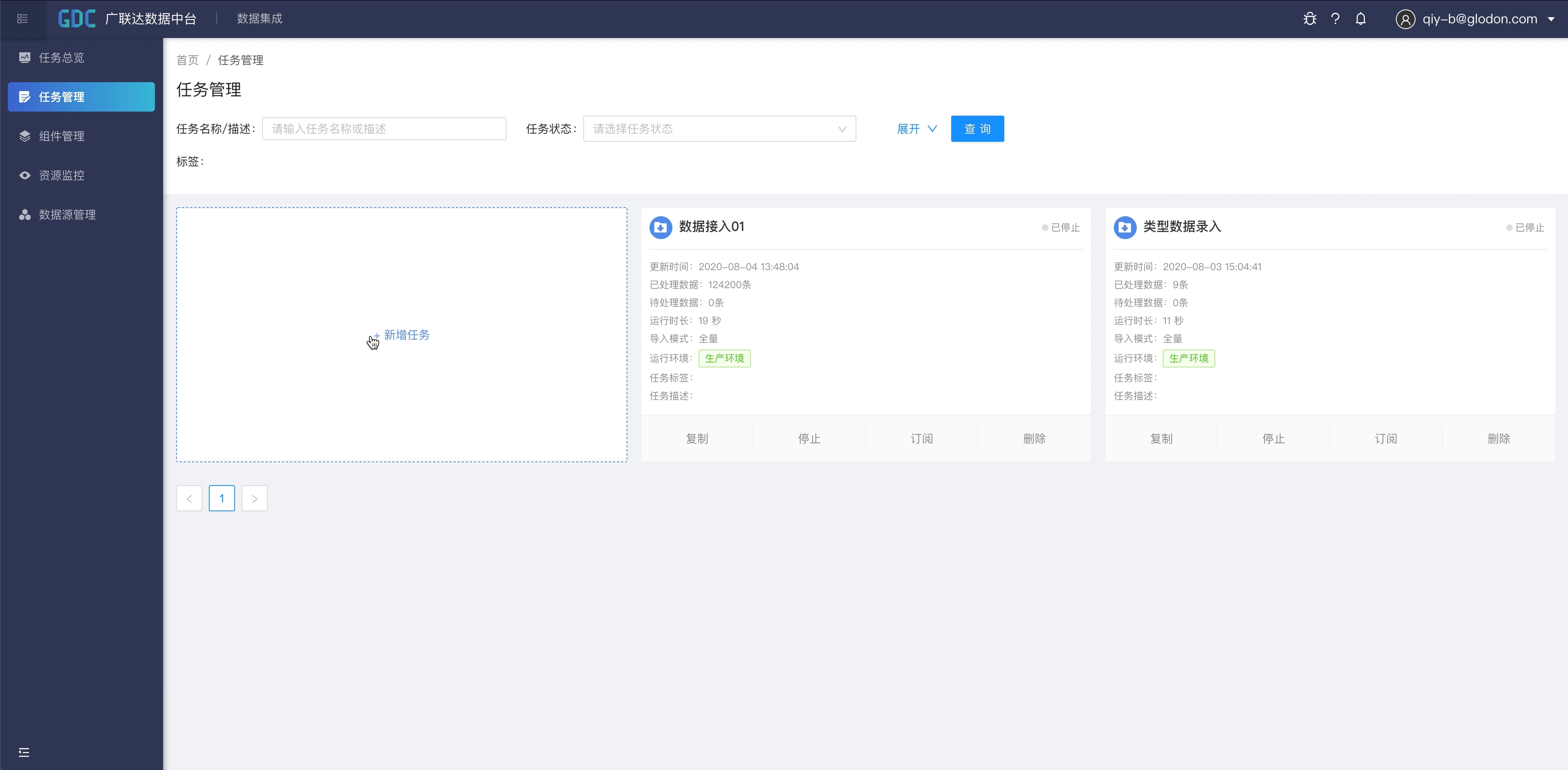 step4:进入数据中台的数据集成模块,进行数据导入,并在导入过程中实现任务状态的监控以及数据准确性校验;