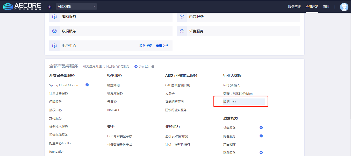 step1:登录AECORE,创建应用,开通金沙9001以诚为本数据中台服务;