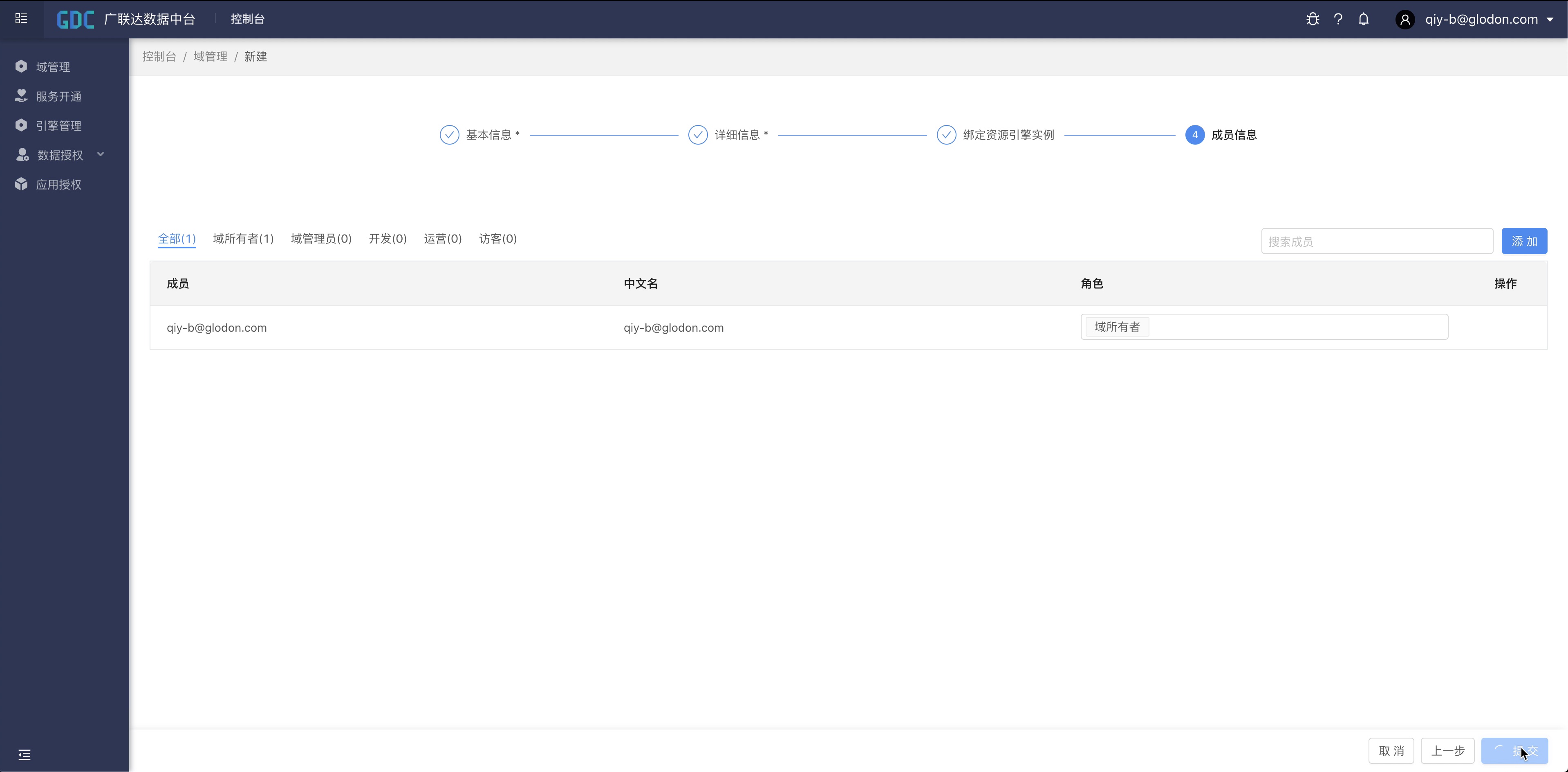 点击“创建域”按钮,输入域的编码、英文名、中文名、描述等信息,点击“下一步”