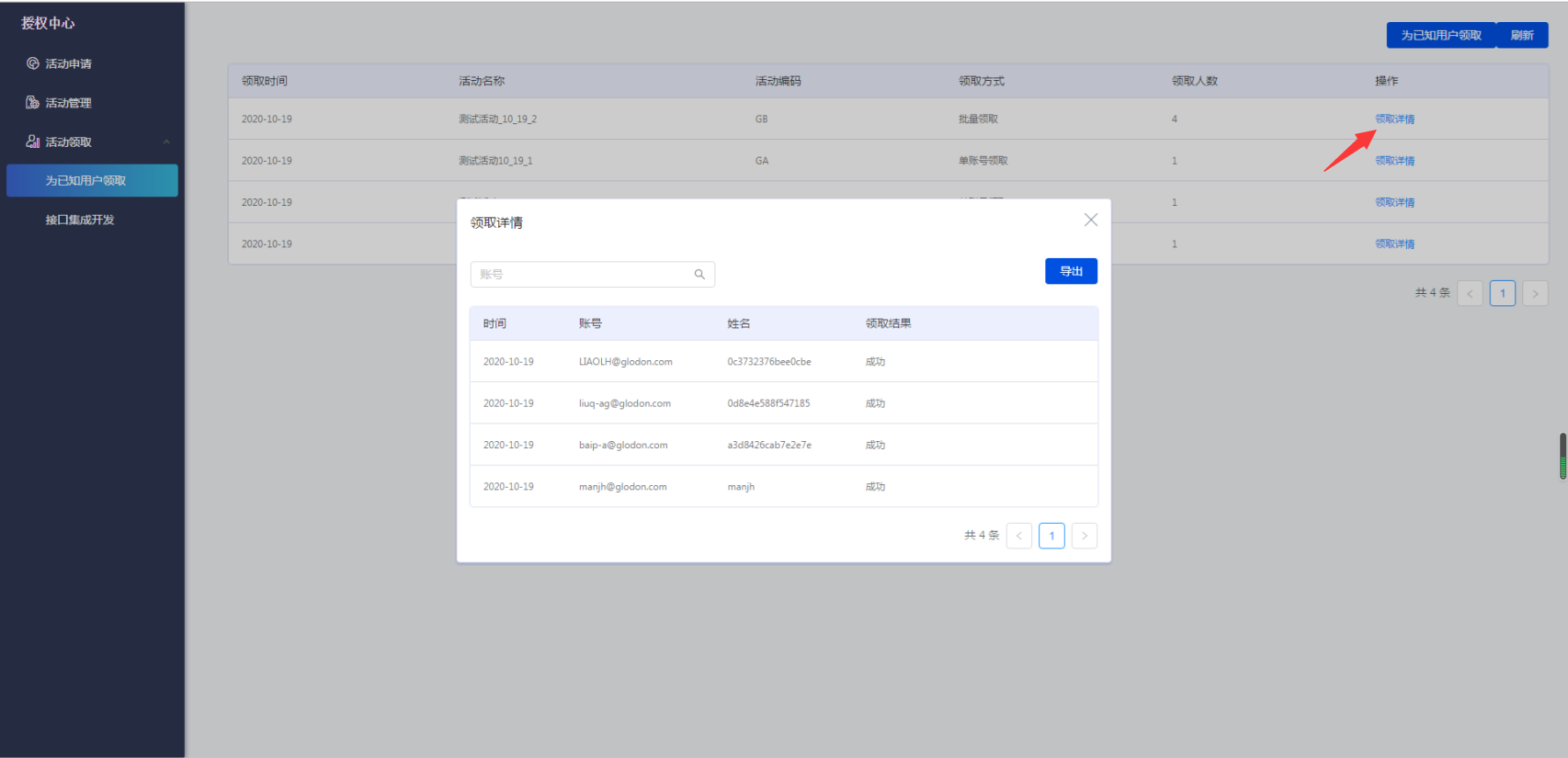 3、活动领取操作完毕,约1分钟后,刷新网页,可以看到本次活动领取操作的摘要信息,在其对应的领取详情中可以看到每位用户参与活动的领取结果。