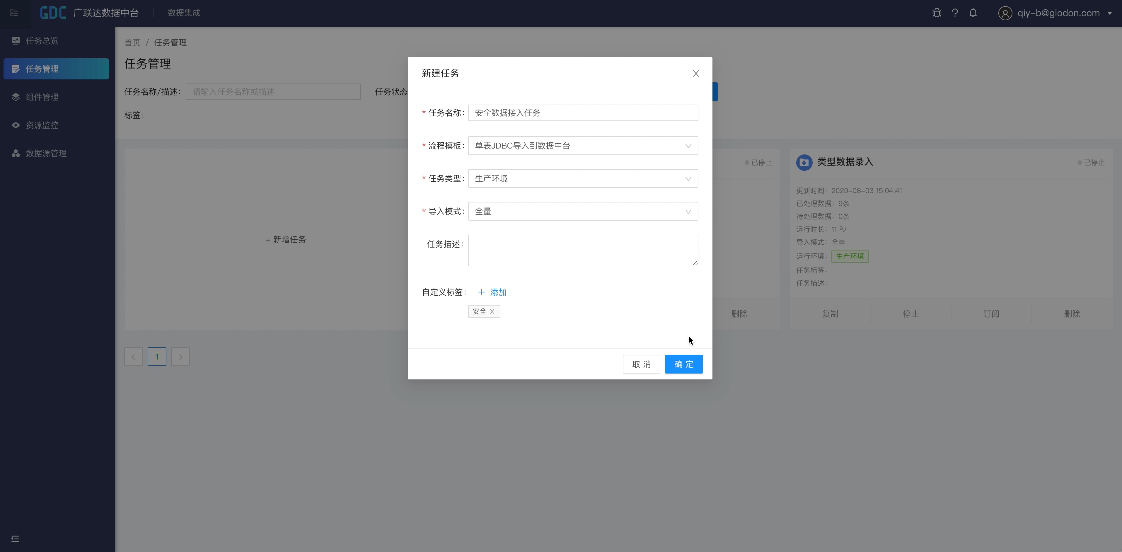 然后选择“任务管理”页面,点击“新增任务”开始创建我们的第一个集成任务。