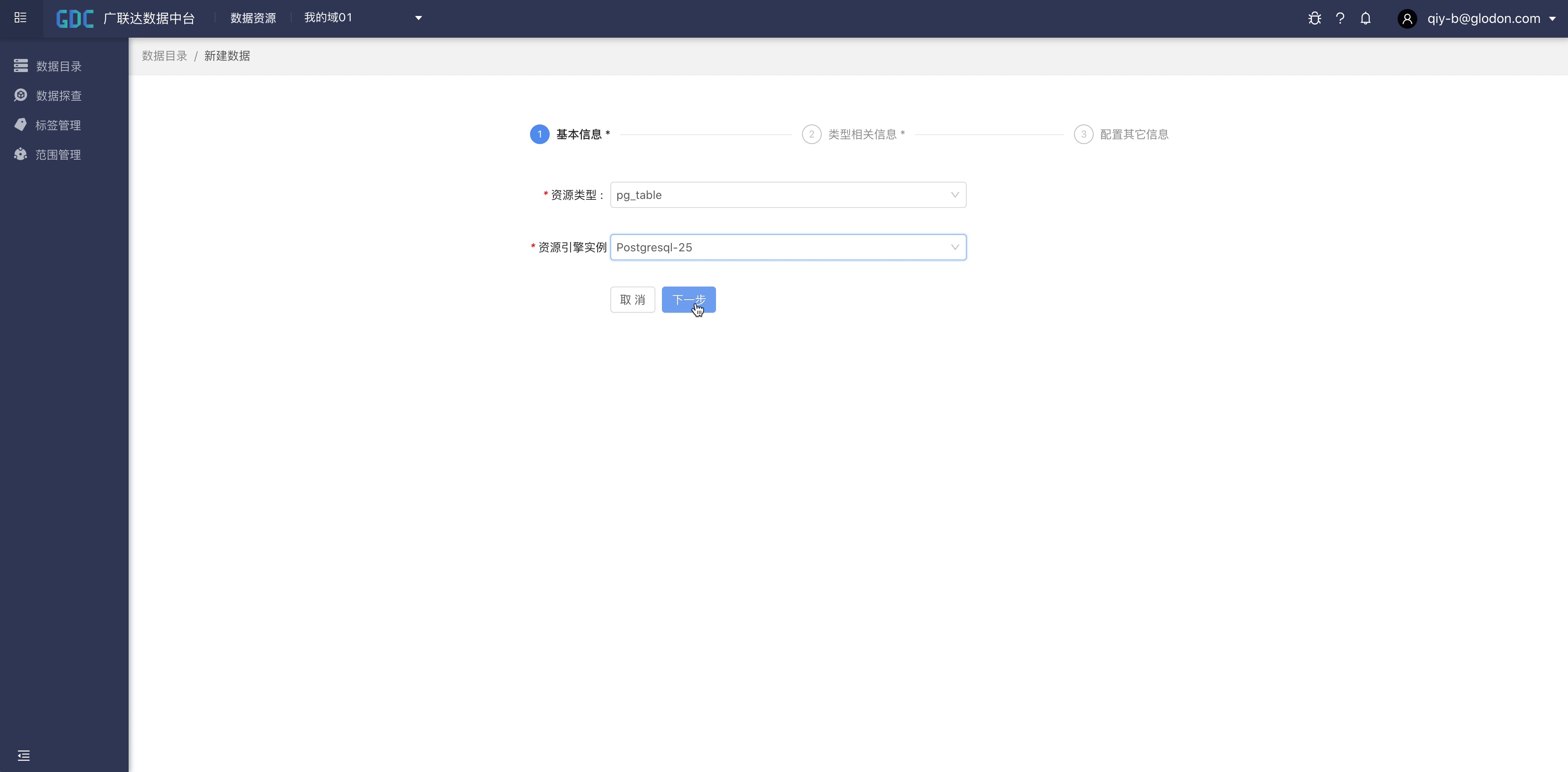 点击“创建域”按钮,输入域的编码、英文名、中文名、描述等信息,点击“下一步”