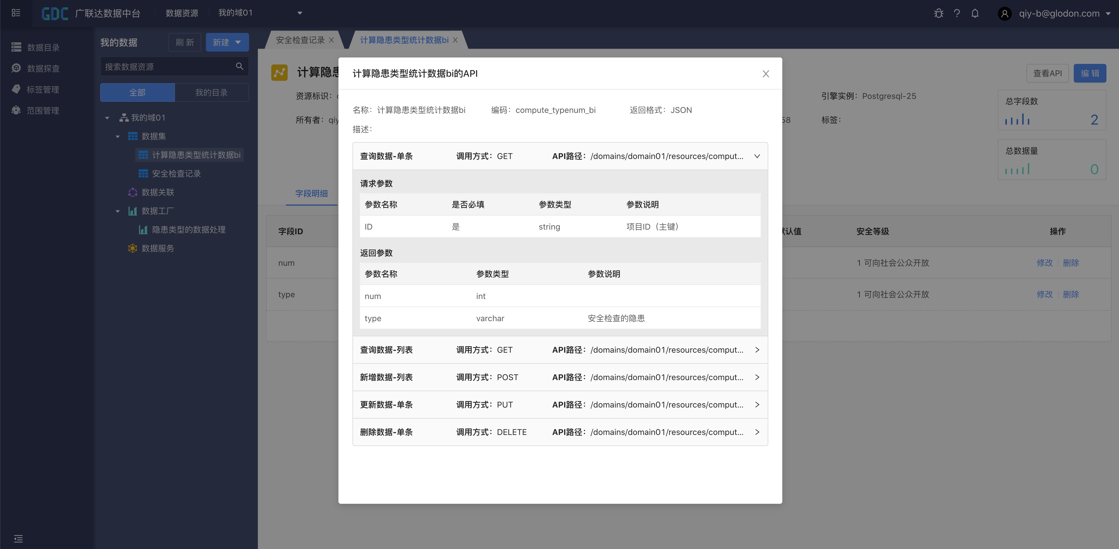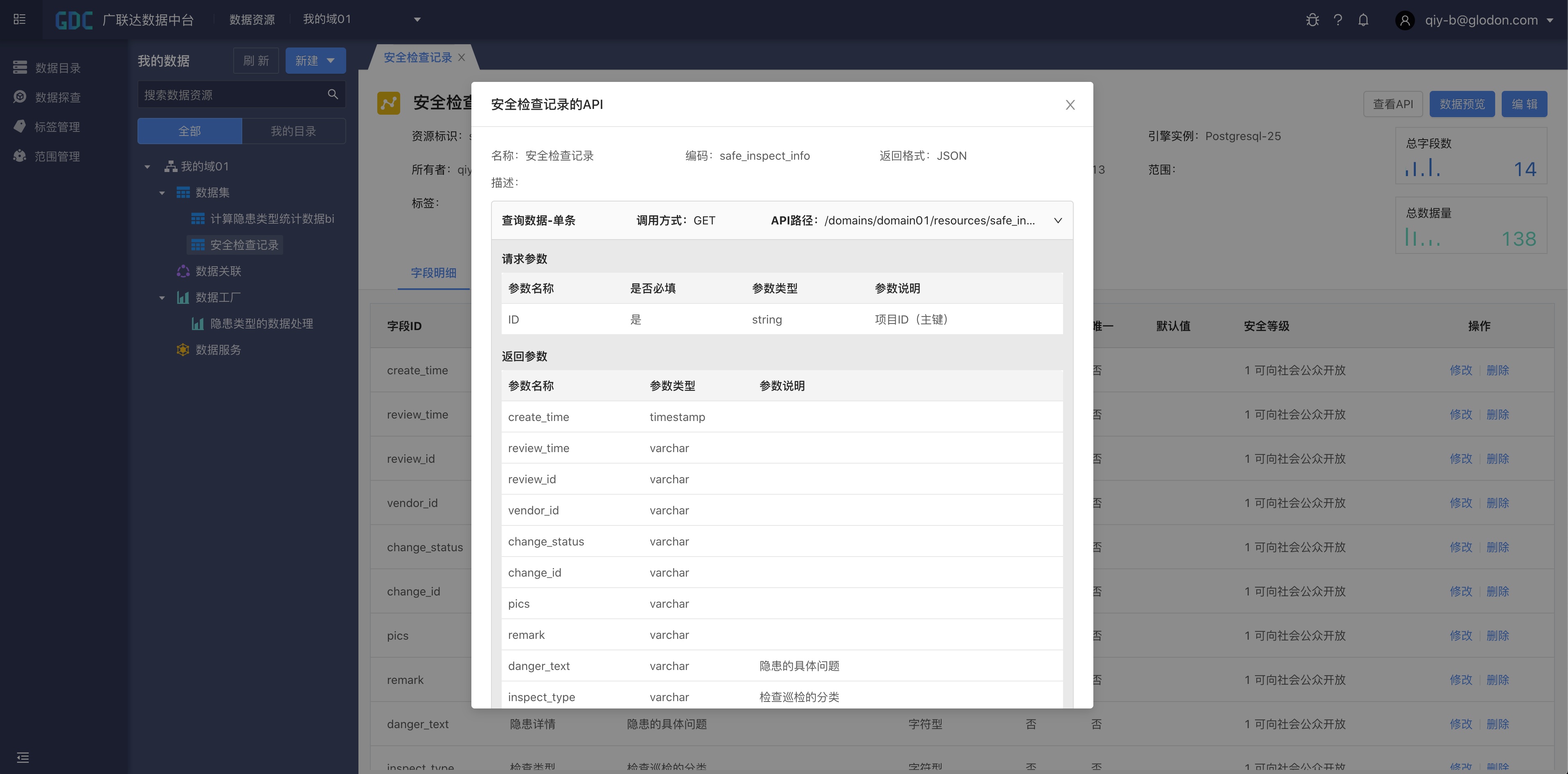 数据导入成功后,我们回到数据资源模块,选择“我的域01/安全检查记录”,点击“数据预览”就可以看到导入的数据了。