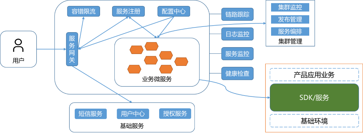 其中,Spring Cloud 提供的基础构件完全满足业务需求,可以直接选择其组件,比如 服务网关Zuul 、链路断熔降级Hystrix等; Spring Cloud 的基础构件不能满足业务需求时,需要开发新的基础组件产品,并需要基于微服务架构的设计思想来开发新的组件产品,比如云中立SDK。